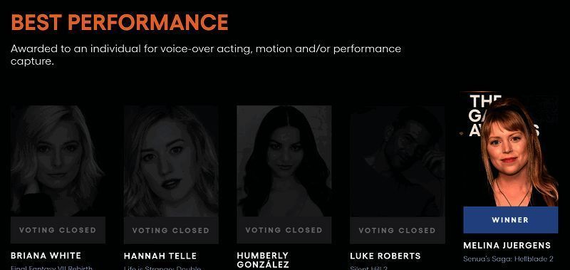 其他提名:Briana White, 《最终幻想7:重生》、Hannah Telle, 《奇异人生:双重曝光》、Humberly González, 《星球大战:亡命之徒》、Luke Roberts, 《寂静岭2》