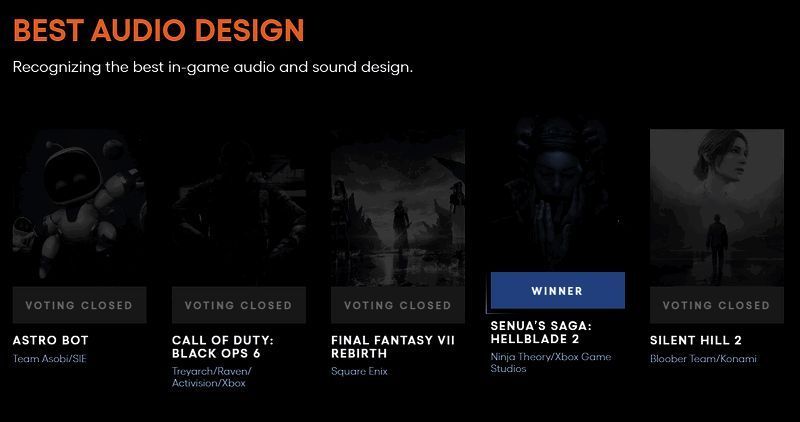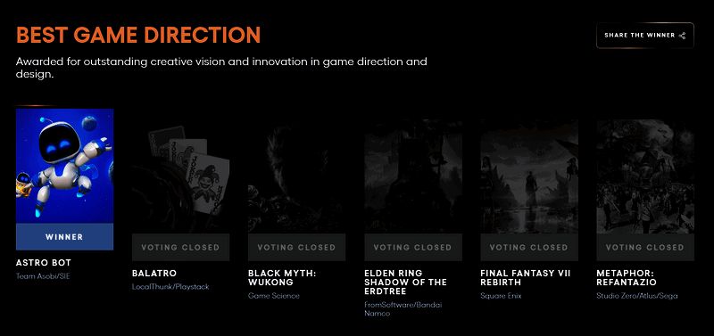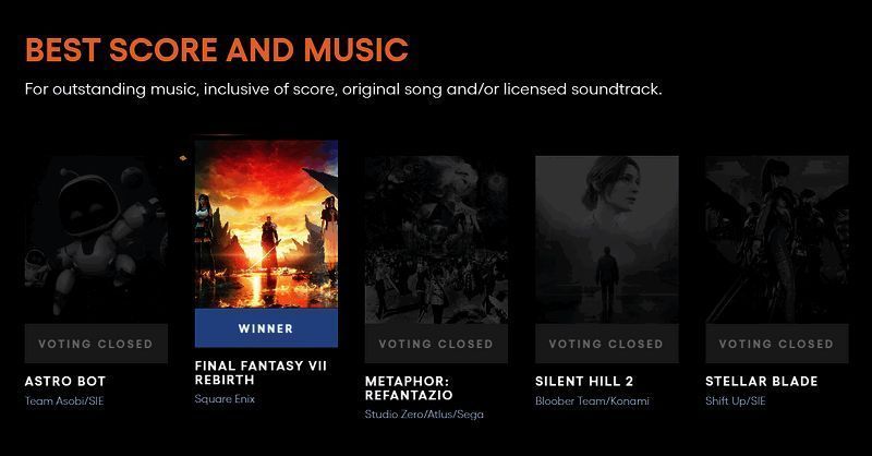 其他提名:《宇宙机器人》《使命召唤:黑色行动6》《最终幻想7:重生》《寂静岭2》