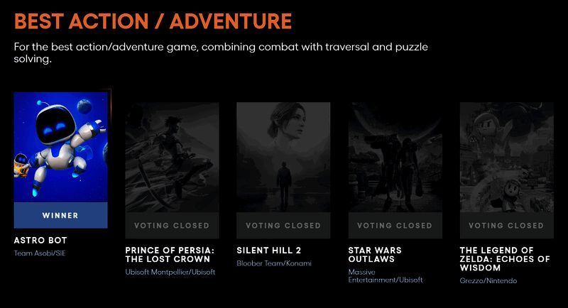 其他提名:《波斯王子:失落的王冠》《寂静岭2》《星球大战:亡命之徒》《塞尔达传说:智慧的再现》
