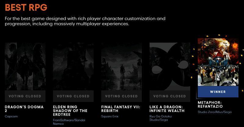 其他提名:《龙之信条2》《艾尔登法环:黄金树幽影》《最终幻想7:重生》《如龙8:无限财富》
