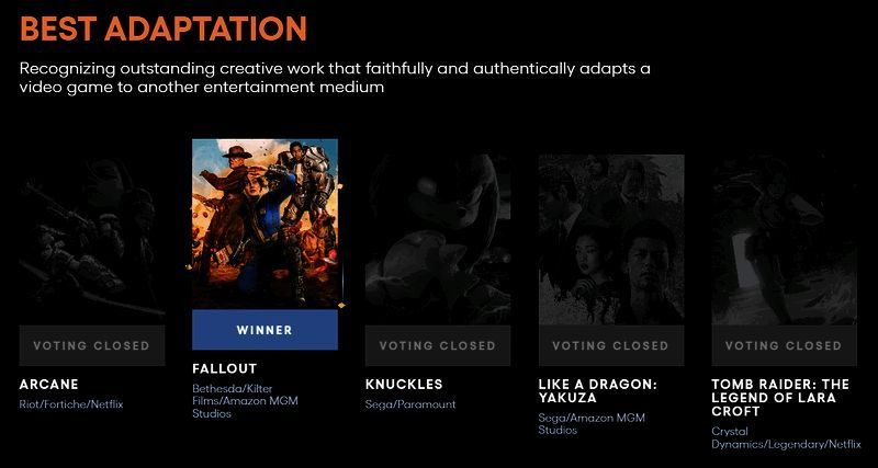 其他提名:《双城之战》动画剧集、《刺猬索尼克:纳克鲁斯》动画剧集、《如龙》真人剧集、《古墓丽影:劳拉·卡劳馥特传奇》