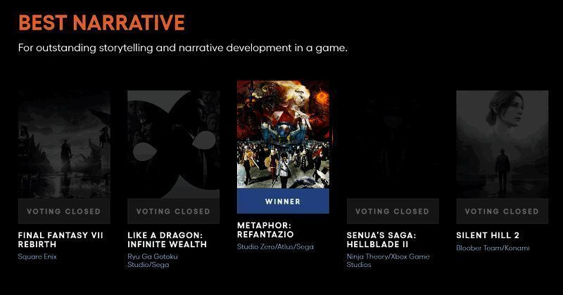 其他提名:《最终幻想7:重生》《如龙8:无限财富》《地狱之刃2》《寂静岭2》