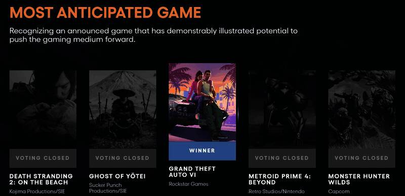 今日(12月13日),TGA颁奖礼公布最受期待游戏奖项,开发世界游戏《GTA 6》获得该奖项。