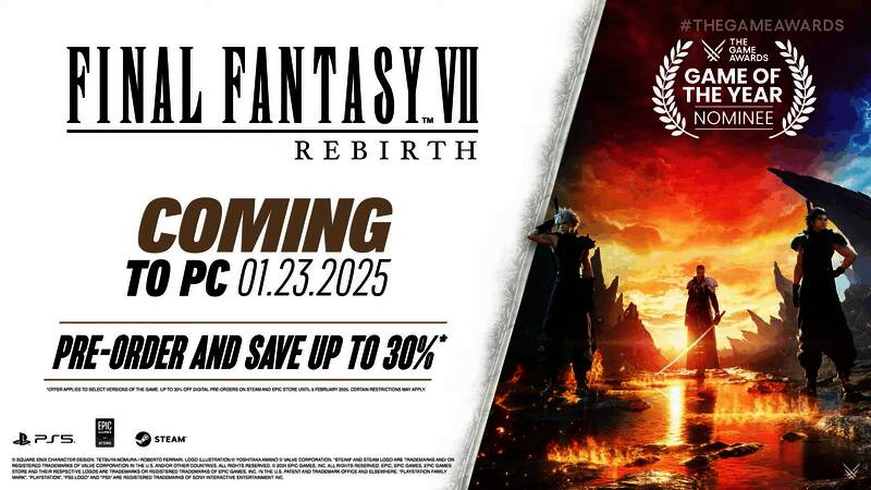 在刚刚的2024 TGA颁奖典礼上,《最终幻想7:重生》宣布将于2025年1月23日登陆Epic和Steam,游戏预购将在晚些时候开启,预购游戏可享7折优惠。