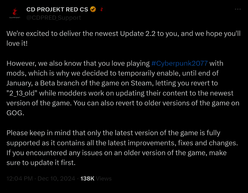 在社交媒体上,CDPR写道:“我们很高兴向各位提供最新的 2.2 版本更新,希望各位会喜欢它!然而,我们也知道各位喜欢使用 Mod 游玩《赛博朋克2077》,这就是为什么我们决定暂时在 Steam上启用游戏的 Beta 分支,直到 1 月底,让各位恢复到‘2_13_old’,而 Mod 制作者正在将他们的内容更新到最新版本的游戏,各位也可以在 GOG 上恢复到旧版本的游戏。”