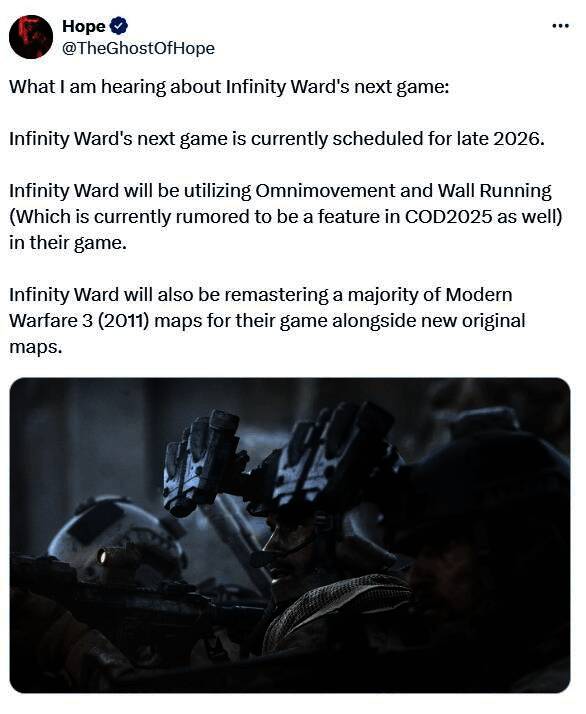 根据知名使命召唤系列爆料人TheGhostOfHope的最新消息称,《使命召唤2026》将是一款由IW开发的现代战争游戏,目前暂定于2026年年底发售,这款游戏将包含“全向移动”和“跑墙”功能(此功能据传也包含在《使命召唤2025》中)。此外,除了新地图外,IW还将重制《使命召唤:现代战争3》(2011)的大部分地图。