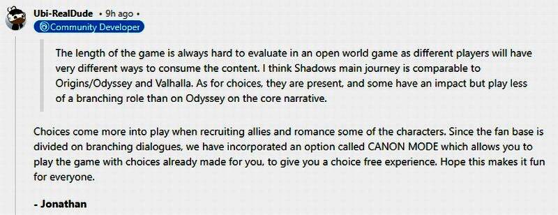最近《刺客信条:影》开发者在Reddit论坛举办问答活动,被玩家问及与《起源》《奥德赛》和《英灵殿》相比,《刺客信条:影》主线时长有多长?创意总监乔纳森·杜蒙特(Jonathan Dumont)回答称:“对于开放世界游戏而言,游戏时长总是很难评估,因为不同玩家会用不同方式来游玩。我认为《影》主线时长能与《起源》《奥德赛》和《英灵殿》相媲美。”