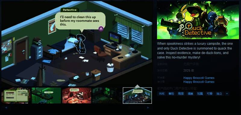当一场怪事发生在豪华露营地时,唯一的鸭鸭侦探被召唤来破解谜团。检查证据,进行推理,解开这起没有谋杀的神秘案件!