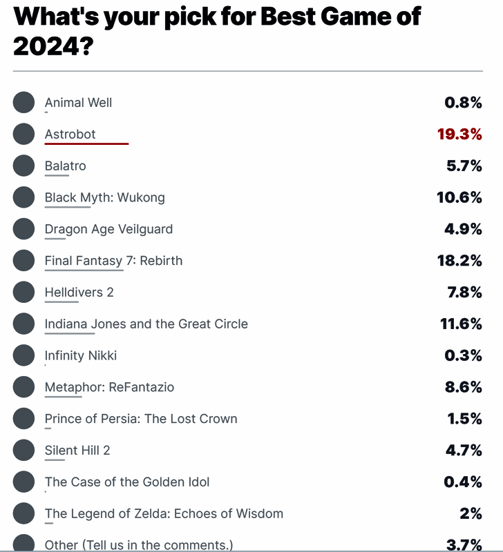 从结果来看,《宇宙机器人》以19.3%的得票率位居第一,《黑神话:悟空》以10.6%得票率位居第四,《最终幻想7:重生》和《夺宝奇兵》分居三四位。