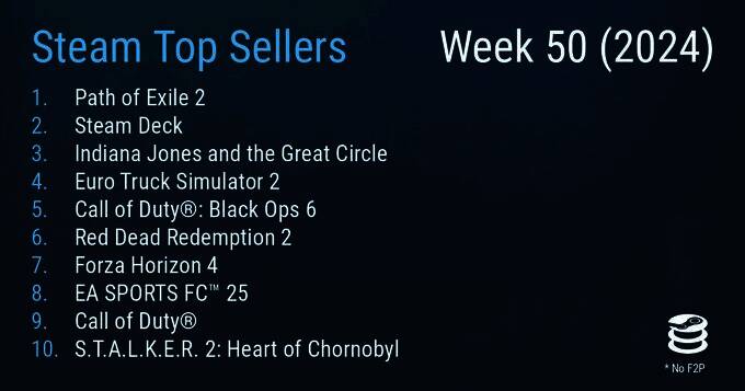 Steam最新一周销量榜出炉(2024年12月3日-2024年12月10日),本周《流放之路2》成功登顶,新作《夺宝奇兵:古老之圈》也登上了榜单。