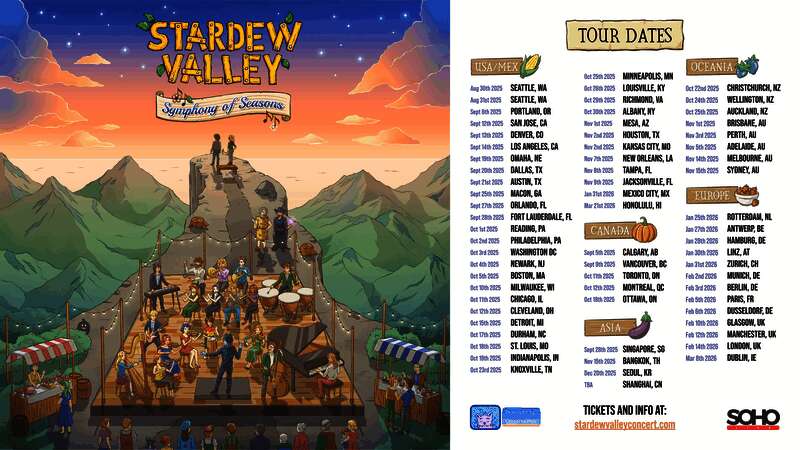 经典牧场系游戏《星露谷物语》官方不久之前宣布将举行第二届音乐会世界巡演,日前宣布追加多场演出,预定2025年8月29日在ConcernedApe的故乡西雅图启动,预计期间长达1年半,2026年3月21日在夏威夷闭幕。