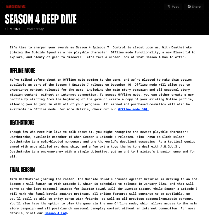 《自杀小队:消灭正义联盟》开发商 Rocksteady 现已正式宣布将停止对游戏的未来支持。在官方网站上得一篇公告中,公司宣布第 4 赛季将是游戏最后一个赛季。
