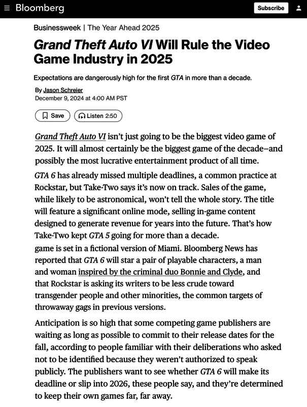 彭博社记者Jason Schreier发布了一篇新报道,透漏了不少关于《GTA6》的幕后消息: