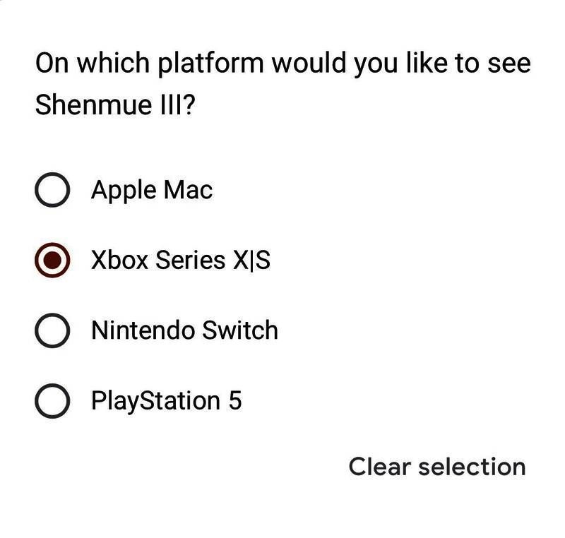 今年11月,《莎木3》的发行权易手,从Deep Silver变成了ININ Games,而现在这个新的发行商发布了调查,想要知道其他平台的玩家(Xbox/Switch等)是否想要《莎木3》这款游戏。