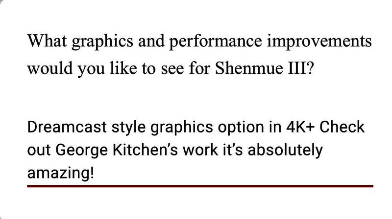 此外还问到玩家期待《莎木3》将获得什么样的画质和性能改进,比如Dreamecast风格的画面(4K)。