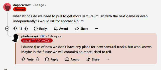 其中有人问PT Adamczyk是否会为《赛博朋克2077》的续作(Project Orion)再次创作武侍乐队的新歌,PT Adamczyk如此回答道:“我不知道,目前我们还没有计划制作下一首武侍乐队的曲目,但谁知道呢。也许将来我们会(收到)委托制作更多,很难说。”