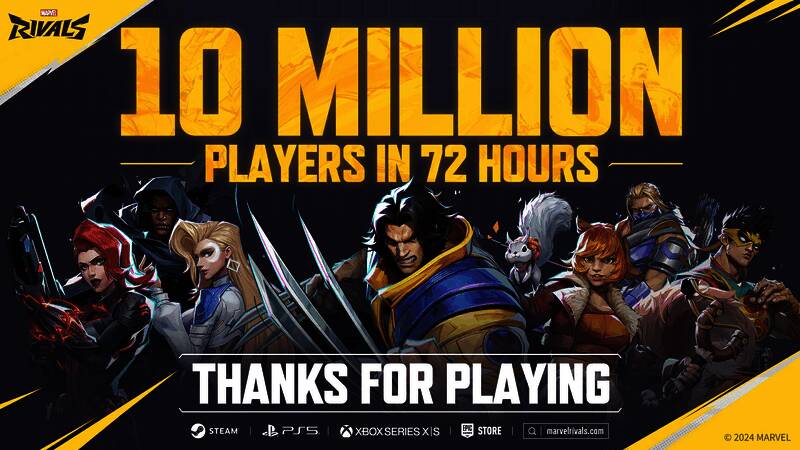《漫威争锋》官推宣布,仅仅72个小时(3天),该作全球玩家已达到惊人的1000万人,非常感谢支持的每一名玩家。