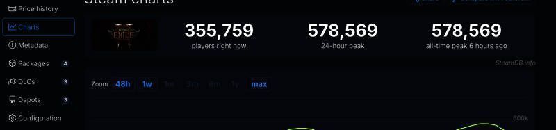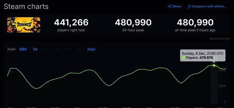 SteamDB显示,《漫威争锋》在线峰值出现在5个小时前,为48万人,但没有超过同期发售的付费游戏《流放之路2》,后者Steam峰值为57.8万人,打破了昨天的记录(54万人)。