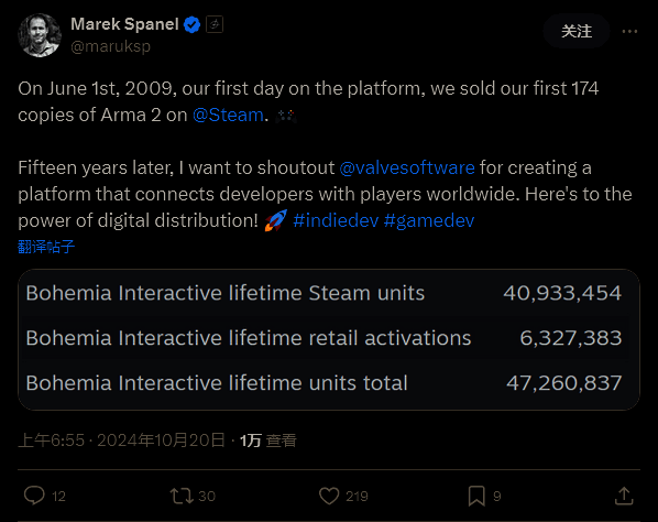 在社交媒体推特上,开发商 Bohemia Interactive 的联合创始人兼首席执行官 Marek Spanel 发帖分享了工作室在25 年期间的所有游戏总销量共计超过4700 万份,其中,超过 4000 万份来自 Steam 平台。