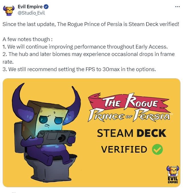 另外,《波斯王子:Rogue》还宣布游戏现已通过Steam Deck验证,玩家现在可以用Steam Deck随时随地畅玩本作了,不过值得注意的是,在Steam Deck游戏中后期,可能会出现帧率下降的情况,官方建议玩家把FPS设置为30max,后续Steam Deck的游戏性能将在抢先体验期间持续进行优化。