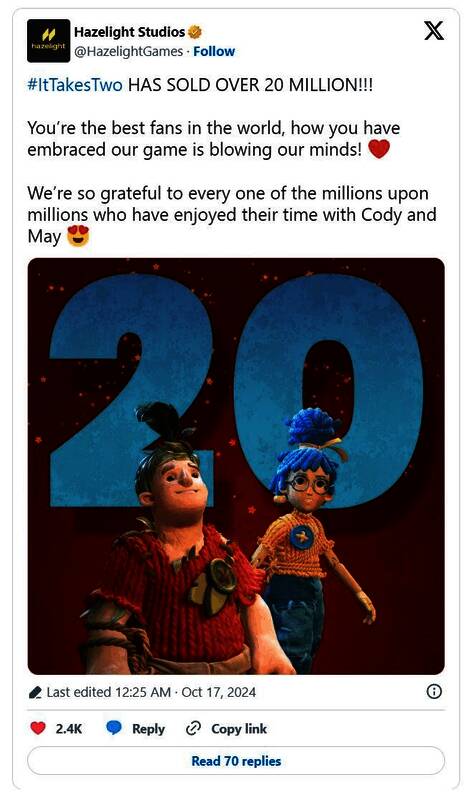 Hazelight Studios 在推特上宣布,《双人成行》现已在全球售出超过 2000 万份。开发者写道:“我们非常感谢每一位享受与 Cody 和 May 时光的玩家。”