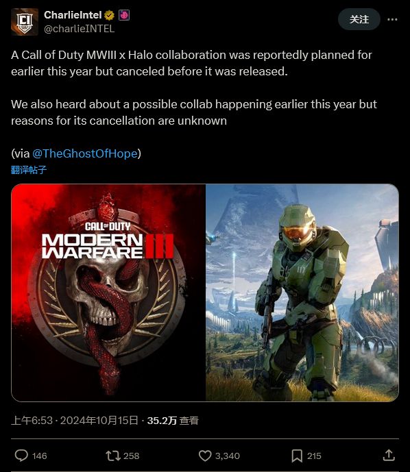 他写道:“《光环》与《使命召唤》士官长联动包居然因为完全位置的原因被取消了。”