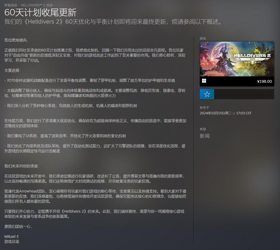 多人合作射击游戏《绝地潜兵2》此前因平衡性等问题引发玩家强烈不满,对此开发商Arrowhead推行“60天更新计划”来应对这一问题。