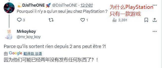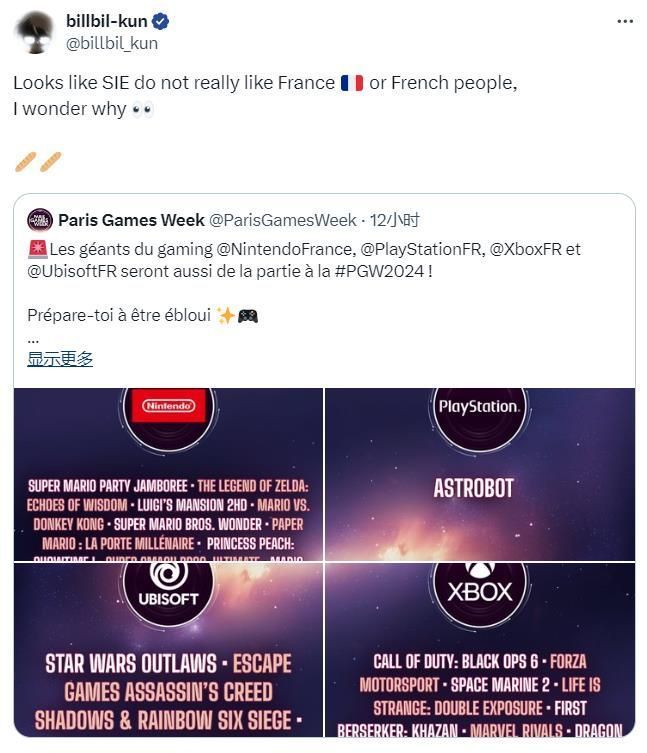 知名法国爆料人billbil-kun也转发了该消息,并说道:“看起来SIE不喜欢法国或者法国人,我不知道为什么”。