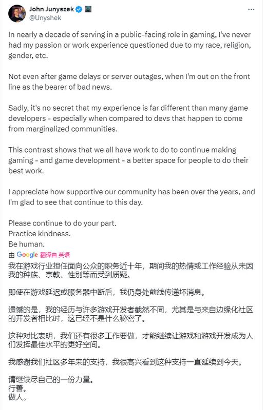 他说:“我的工作从未因我的种族、宗教或性别而受到质疑。我的经历与许多游戏开发人员的经历大相径庭,这并不是什么秘密。善待他人。要有人性。”