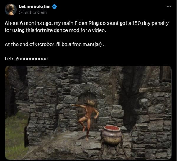 近日壶头哥在个人推特账号上透露,由于经常在《艾尔登法环》的游戏中使用《堡垒之夜》的舞蹈MOD,而导致自己的主账号被封禁180天。不过在10月底,其账号将“重获自由”。