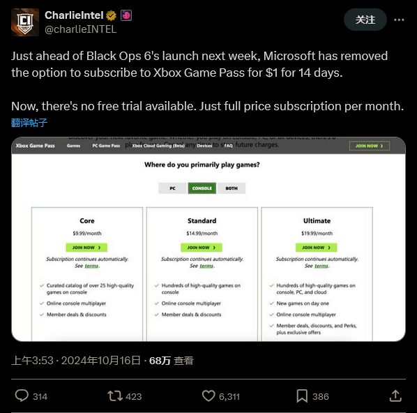 目前最便宜的包含了《黑色行动6》首发体验的 Game Pass阶层售价 20 美元。据报道,微软内部曾对于将《使命召唤》新作带到 XGP 上是否会影响游戏销量存在许多争议,取消 XGP 低价优惠可能会减少内部的部分担忧。