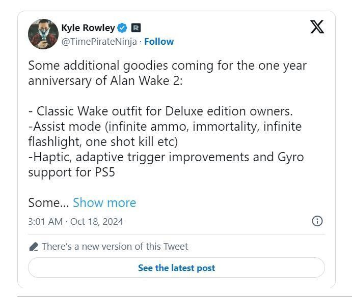 游戏总监凯尔罗利在推特上透露,Remedy 即将推出免费更新来庆祝 《心灵杀手2》推出一周年。此次更新的亮点是为那些想更轻松游戏的玩家提供了新的辅助模式。该模式将包含无限弹药和无限手电筒电池。你也将无法死亡,所有敌人都将一枪毙命。