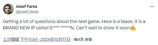 Josef Fares在帖子上说道:“收到了很多关于下一款游戏的问题。这里有一个预告。这是一个全新的IP,叫做S*** ******N(三个字母的单词后面跟着七个字母的单词)。迫不及待地想要尽快展示它。”