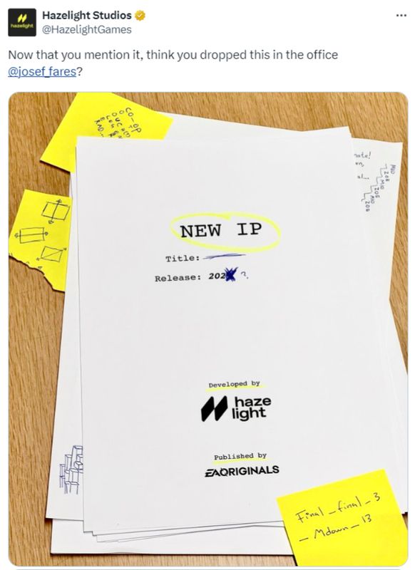 随后,Hazelight Studios的官方社交媒体账号也转发了该消息,并贴出了另一个神秘预告,一张图片显示了一张放在桌子上的文件夹,其中附有几条线索,右下角写着“Final_final_3”和“_Mdown_13”,右上角写着“Mio Zoe”,而左上角则用“Co-Op、Ouch(?)、Legen-、Rad……”等拼出了“Cooler”这个单词。最后,文件还显示该游戏将于202X年发售。
