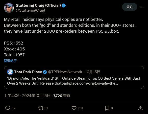 据游戏新闻播客 Side Scrollers Podcast 所有人 Stuttering Craig 在推特上分享,他从零售业内人士处获得消息,《龙腾世纪:影障守护者》在 PS5 和 Xbox 平台的实体总预订量仅为1957 份。其中 PS5 为 1552 份,Xbox 仅有 405 份。这是包含了游戏的基础版本和高级版,涵盖了 800 家商店。