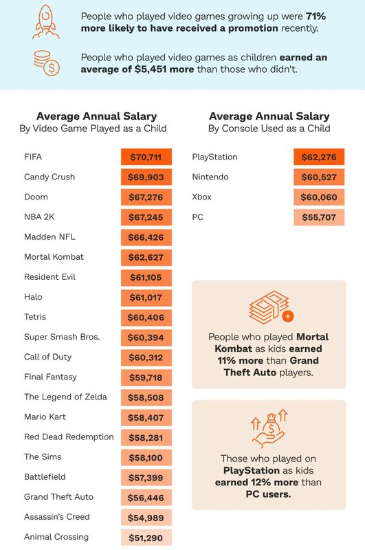 大多数玩家小时候后最常玩的游戏:《马里奥赛车》占51%,《俄罗斯方块》占41%、《塞尔达传说》占40%、《GTA》占39%、《任天堂明星大乱斗》占38%。所有游戏中玩《FIFA》系列的玩家长大后平均收入最高,平均年收入为70711美元。