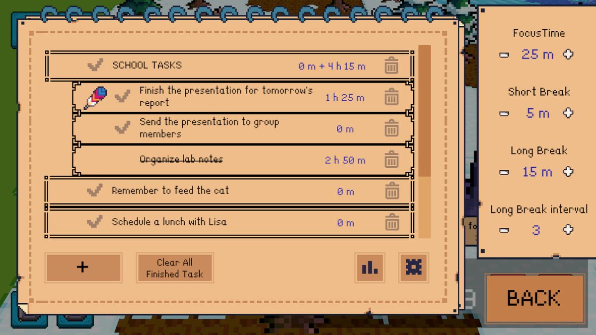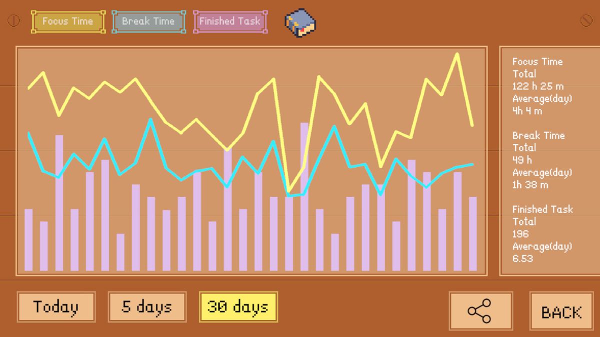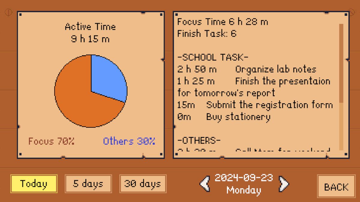在冒险之余,游戏也会记录个别任务的花费时间,以及每天的专注时间长度。