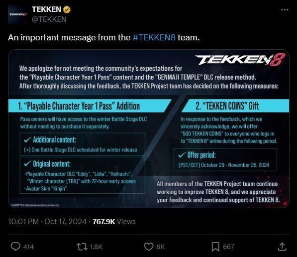 因此官方决定将即将到来的“冬季战斗阶段”DLC自动添加到已拥有年1季票玩家的游戏中,此外所有《铁拳8》的玩家还可在10月29日至11月26日期间登录游戏,并领取可在游戏内购买DLC“GENMAJI TEMPLE”的相应费用(500铁拳币,美区价值为5美元)。