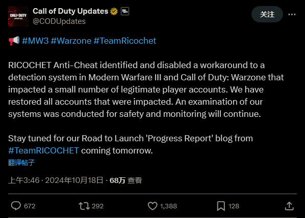 游戏的更新官方社交媒体写道:“RICOCHET反作弊团队确认并禁用了一个在《现代战争3》以及《使命召唤:战区》中检测系统的临时权宜功能,该功能影响了少量正常玩家的账户。我们已经恢复了所有受影响的账户。”