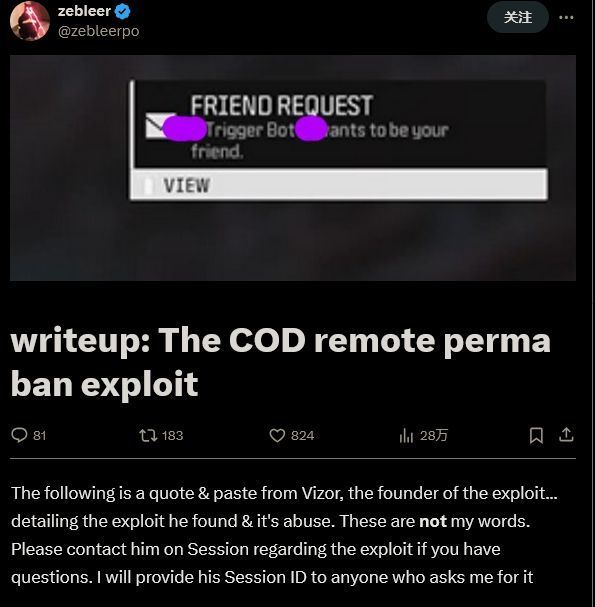 根据一份来自外挂制作者在社交媒体上发布的文章称,这个漏洞已经被发现了几个月之久,这段时间以来许多人一直在使用它封禁别的玩家,甚至针对性的攻击一些主播。让他人被封禁只需要和目标在同一个大厅里并在聊天中输入一些特定文字即可,例如“TriggerBot“——也就是自动点击外挂,会在你的鼠标移动到可以击杀敌方玩家的地方时自动进行鼠标/手柄扳机输入。