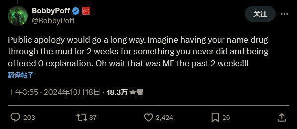 一位名叫 BobbyPoff 的《使命召唤:战区》主播就相信自己是该漏洞的受害者,他在10 月 3 日被永久封禁,之后在数周期间不停的和网上许多指责他作弊的人争吵,并向动视的客服多次提出投诉。现在他的账号已被修复,但他的名誉受到了永久损害。在推特上,他希望动视能够向他道歉。