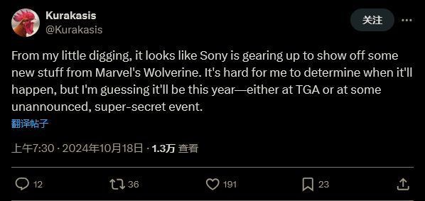 在社交媒体上,泄密人士 Kurakasis 透露道:“根据我的调查,索尼似乎正准备展示《漫威金刚狼》的一些新东西。我很难确定什么时候会公开,但我才会使今年内——要么是在 TGA 上,要没事在某个还没宣布的超级秘密活动期间。”