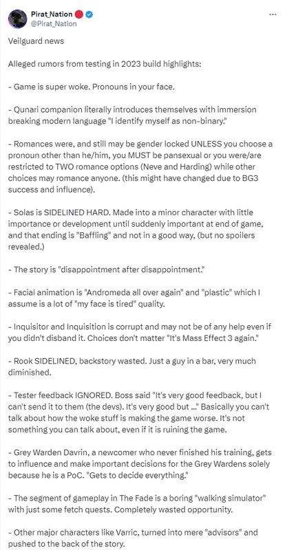 John透露,《龙腾世纪:影障守护者》的玩法也深度依赖觉醒领域(woke territory),但这并不是唯一的问题。游戏的故事和对话也受到了测试员的严厉批评。