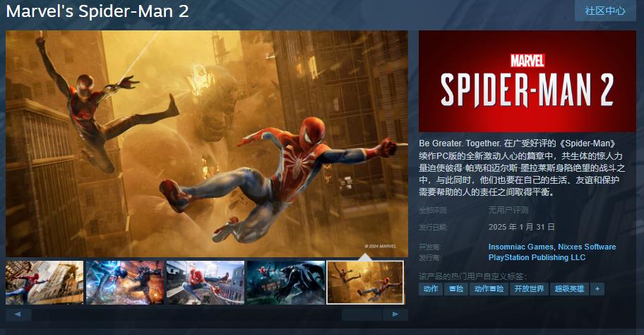 今日(10月19日),Insomniac Games最新作品 《漫威蜘蛛侠2》Steam页面已上线,预计于2025年1月30号发售,游戏支持简繁体中文,感兴趣的玩家可以点击此处进入商店页面。