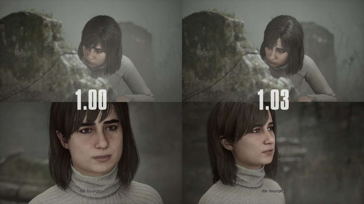 除了缺少润色之外,《寂静岭2:重制版》的1.00版本与较新的1.03版本还有一些其他显著的不同。在两个版本中,一些过场动画的视角不同。此外,在1.00版本中,安吉拉的眉毛要浓密得多。这些差异可能是由于在游戏开发的润色阶段进行的艺术改动造成的。