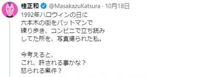 奇装异服逛街购物?这在日本似乎很常见,没想到这位居然是鼎鼎大名的漫画家,日前桂正和晒珍稀旧照,日版蝙蝠侠COS惟妙惟肖,引发网友热议点赞。