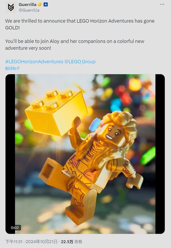 开发商 Guerrilla 宣布,“地平线”系列同主题游戏《乐高地平线大冒险》已经完成开发定版(gone gold)。该游戏将于 11 月 14 日在 PC、PS5 和任天堂 Switch 上推出。