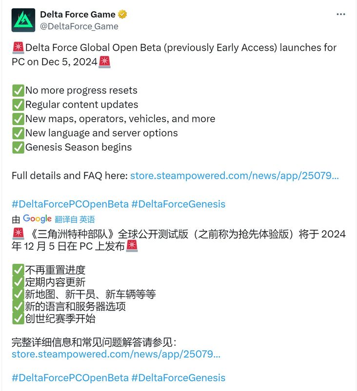 今天有一个好消息想要分享给大家,由于游戏最新版本开发情况乐观,所以为了能让大家更早的感受到内容更丰富、体验更好的Delta Force。我们决定取消Early Access阶段,在12月5日全面开启PC全球不限号不删档Open Beta!