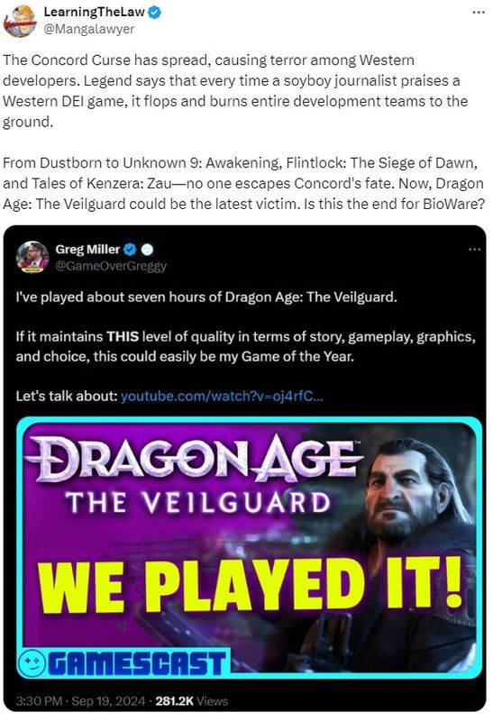 近日游戏博主Mangalawyer发推文,调侃近期包含DEI元素游戏作品,比如《星鸣特攻》等,都像是被诅咒了而陷入巨大困境中。