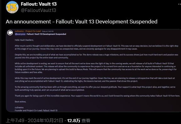 原计划让玩家在游戏中玩到经典一代内容,《辐射4》饭制还原初代MOD《Fallout: Vault 13》开发已经停止,开发者表示并非来自B社压力而是自身的原因,而且稍后就会开源所有已完成内容,或许会有高玩粉丝接受。